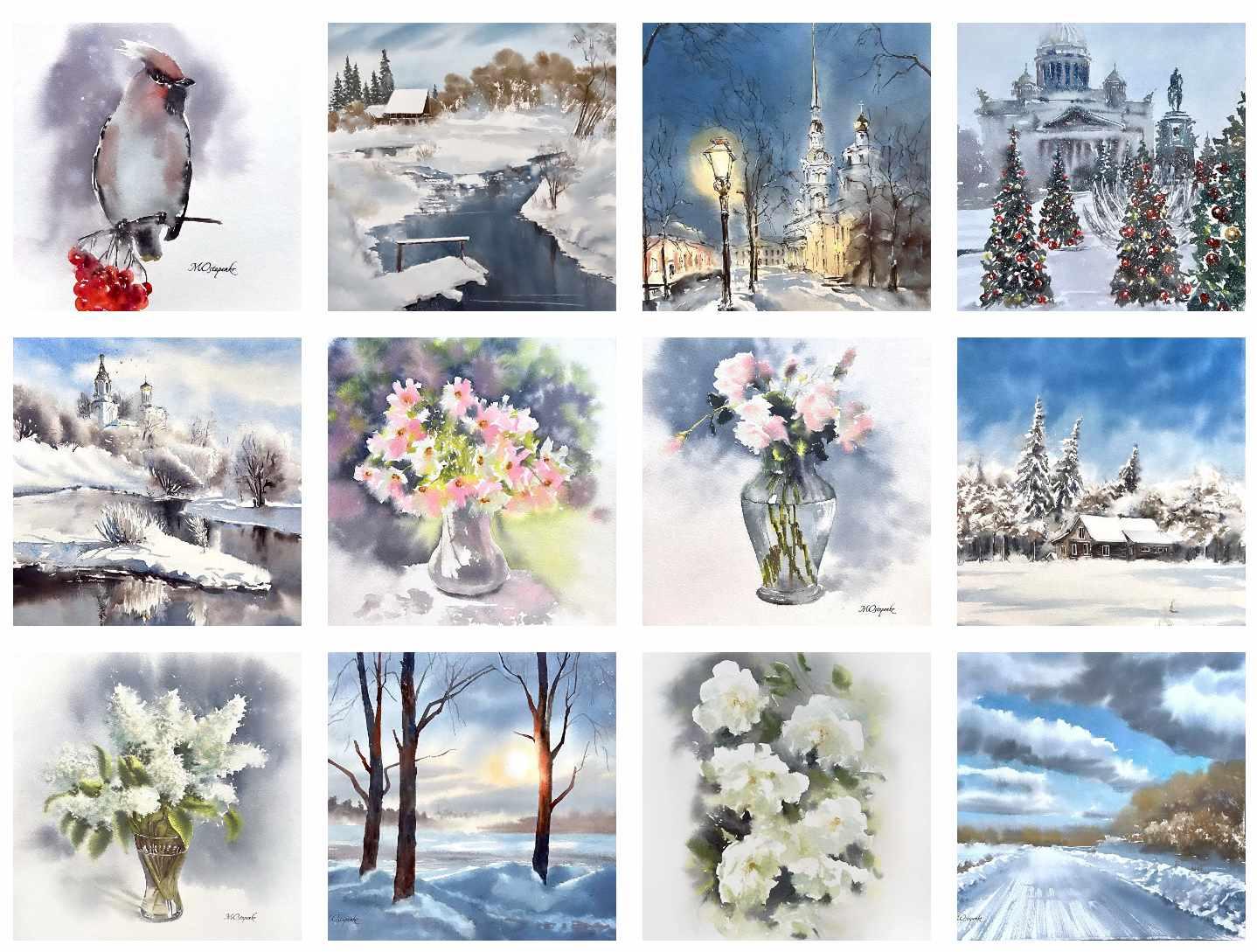 Курс пейзажный, поскольку именно с пейзажей легко начинать, они позволяют делать большие заливки, а значит осваивать технику на хлопке по-мокрому, параллельно с этим изучая необходимую теорию. В курсе нет примитивных сюжетов. Задания не позволят вам делать детские рисунки, не будет «рисуем елочку поэтапно». Все они полноценные, серьезные, очень полезные, но совсем не скучные! Вы создадите полноценные работы, которыми будете гордиться. Вы не будете повторять шаблоны, но освоите все навыки и приемы, нужные для пейзажей, узнаете основные принципы, позволяющие вам создавать собственные картины.