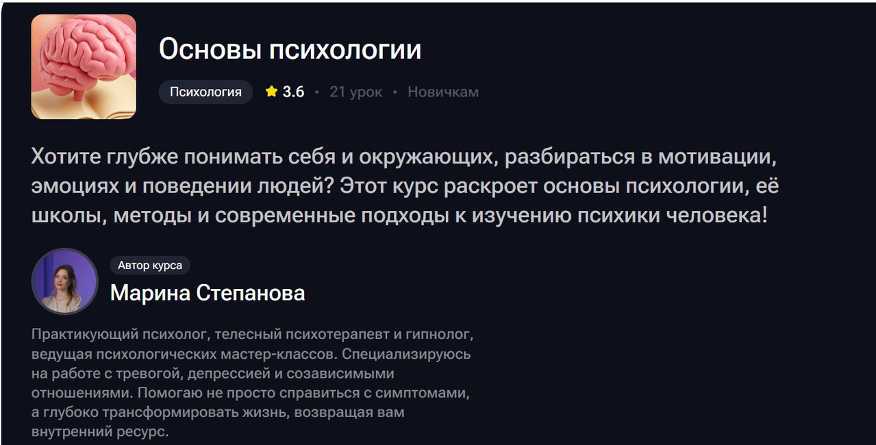 21 занятие с Мариной Степановой — это твой личный гид по самой захватывающей территории на свете: человеческой психике. Причём без того занудного академического языка, от которого хочется уснуть лицом в конспект.