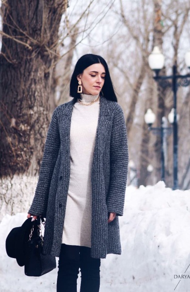 Я использовала Alize LanaGold (49% шерсть, 51% акрил, 100 гр/240м), расход 1000 гр. Рекомендуемая толщина пряжи 150-300 м на 100 гр. Чем толще, тем плотнее и объемнее получится пальто.