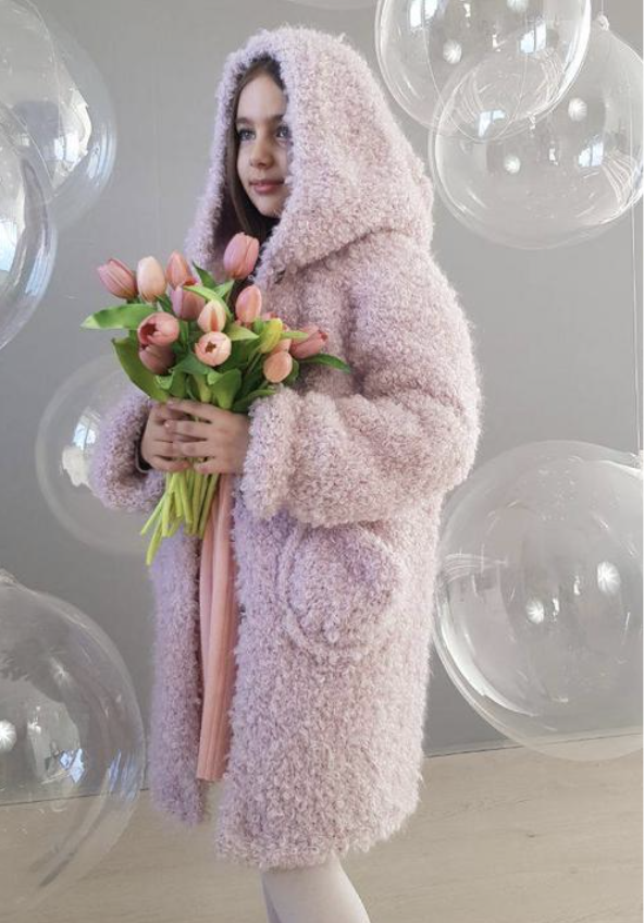 Пальто вяжется сверху вниз от капюшона, с анатомическим ростком и регланом.