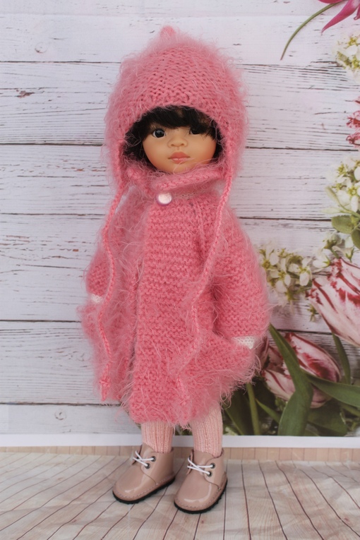 В комплект Пастила вошли-платье с жаккардом, колготки, пушистое пальто с кармашками и шапочка с ушками.