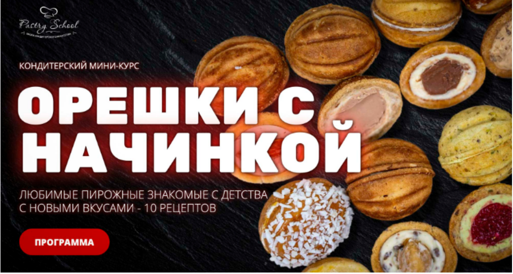 Мини-курс включает в себя подробный видеоурок по приготовлению пирожных (на примере орешков «Шоколад-Клубника »), объясняющий всю технологию и принципы приготовления пирожных, а также Книгу рецептов с подробным пошаговым описанием приготовления 10 вариантов вкусов этого вкуснейшего десерта.