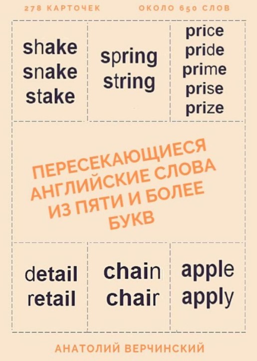 Что общего у этих английских слов? APPLE — APPLY, SMART — START, MARRY — MERRY. Все эти слова отличаются всего одной буквой, такие слова автор назвал пересекающимися. Вместо заучивания каждого слова по отдельности намного эффективнее учить их группами из пересекающихся слов, которые пишутся похожим образом. При этом запоминается не только перевод, но и правильное написание. В третьей книге серии на 31 листе содержится 278 карточек, с помощью которых вы запомните около 650 английских слов.