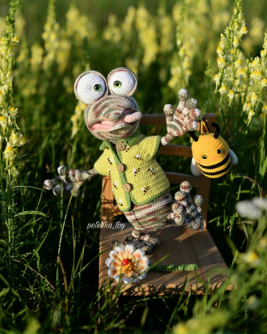 В МК входит описание вязания ящерицы, рубашки и рюкзака-пчела.