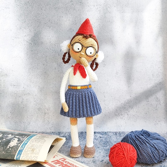 Кукла вяжется снизу вверх, «полукрестиками», по спирали. От подошв и до макушки. Руки ввязываются, уши вывязываются из головы, парик пришивается. Глаза пришивные (пуговицы). Юбка, пилотка, пионерский галстук – съёмные.