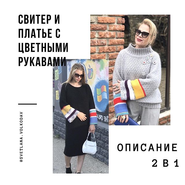По многочисленным просьбам автор подготовила описание платья с цветными рукавами. Бонусом для вас в него включено и описание свитера по мотивам этого платья!