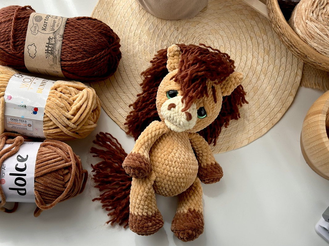 Мк по описанию вязания крючком лошадки из плюшевой пряжи.