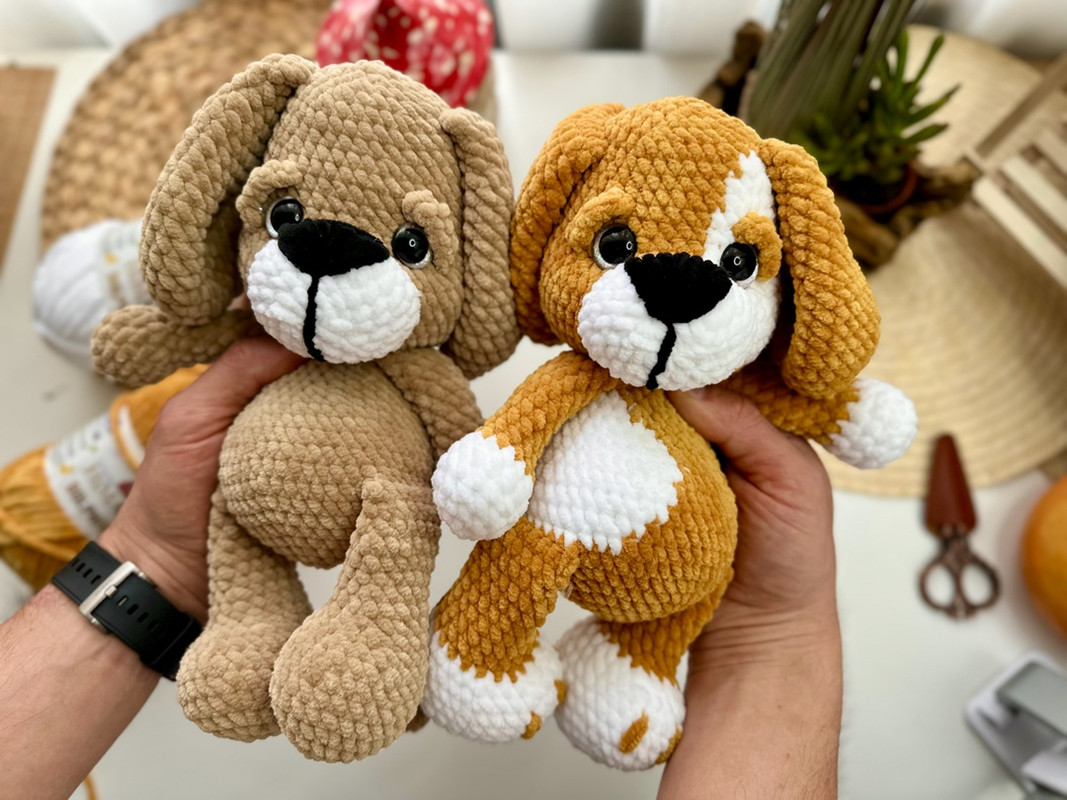 В МК описано как связать простого однотонного щенка и щенка с пятнами.