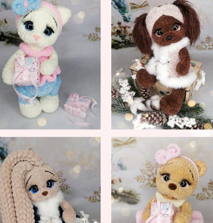 По данному МК Вы сможете связать мишку, зайку, кошечку и спаниельку. Одежда и аксессуары входят в описание. Рост готовой игрушки 21-23см при соблюдении всех рекомендаций.