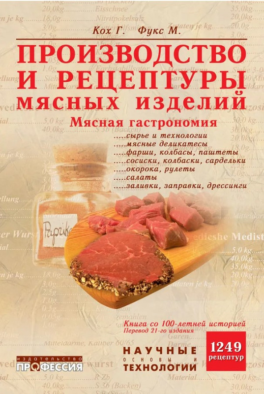 Справочник по производству мясных изделий, известный во всем мире как «Кох», издается в Германии уже более 100 лет. Отечественным специалистам предлагается перевод последнего, 21-го издания (2003 г.), в котором наряду с основными технологическими приемами (тепловая обработка, сушка, копчение, посол и т. п.) представлены 1250 рецептур изделий из мяса и птицы — колбасы всех типов, колбаски, сосиски, зельцы, мясные изделия в желе, мясопродукты пониженной жирности, рулеты и паштеты, полуфабрикаты, блюда из фарша, мясные супы, салаты, заправки и т. д. (из расчета на 100 кг сырья).