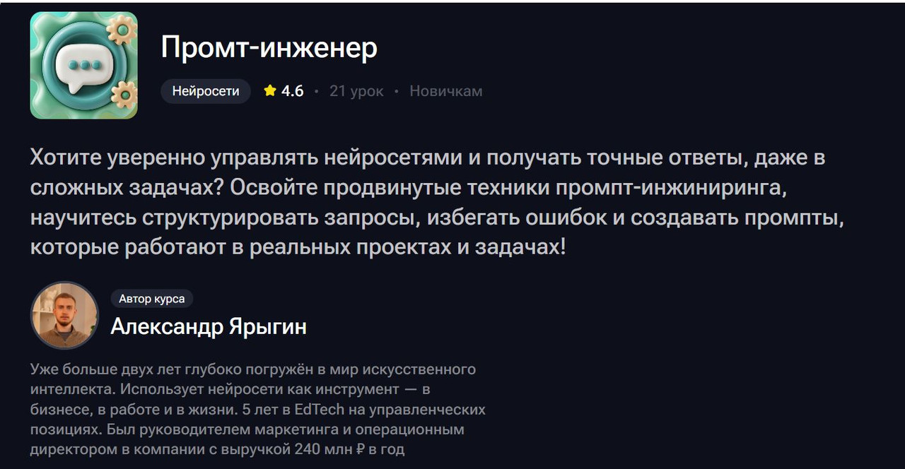 Александр не теоретик, который изучил тему по статьям. Он использует нейросети в бизнесе, в работе, в повседневных задачах — каждый день. Его подход: не «вот как может быть в идеальном мире», а «вот как работает у меня и у сотен моих учеников прямо сейчас».