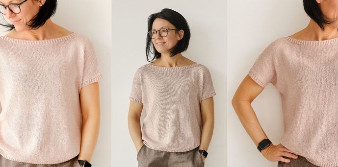 Простая лаконичная футболка спицами, которую можно связать из хлопка, льна или шелка для лета. А можно связать из шерсти или полушерсти для холодного времени года, под пиджак или кардиган. Топ вяжется снизу вверх с плечевыми швами.