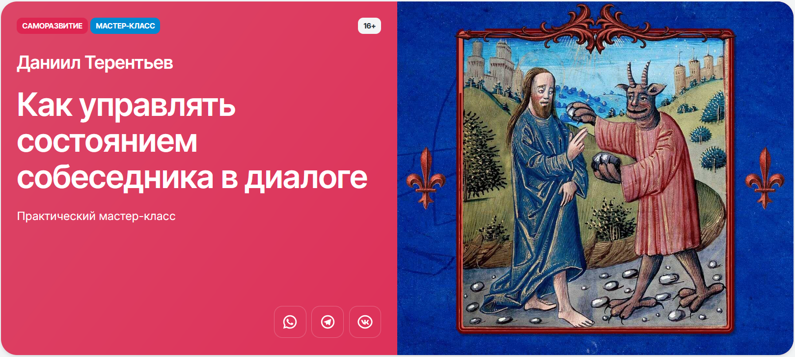 Эксперт по риторике и мышлению Даниил Терентьев убеждён, что на самом деле диалог — это управление состоянием людей. Именно от того, в каком состоянии находится собеседник, зависит, договоритесь вы или нет. Иногда всего одна фраза может изменить настрой собеседника, и на мастер-классе вы увидите, как работает эта динамика на практике.