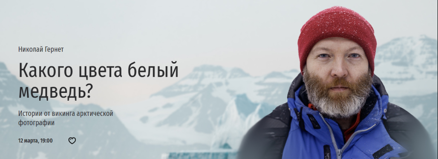 Фотографа Николая Гернета прозвали «викингом арктической фотографии». Он работает в Национальном парке «Русская Арктика» и регулярно ездит в экспедиции по Северному Ледовитому океану. На встрече в лектории «Прямая речь» Николай расскажет о своих путешествиях и ответит на ваши вопросы. Обязательно будут и фотографии, и видеоролики — все, чтобы вы могли на себе ощутить дыхание Арктики.