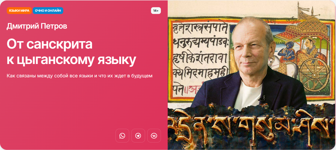«Санскрит — один из древнейших языков мира, на котором уже три тысячи лет назад писали философские трактаты. Он дал корни целому ряду современных языков, включая русский, английский и персидский. А цыганский язык — живое доказательство лингвистической миграции: он вырос из древнеиндийского, но за тысячу лет впитал персидские, греческие, славянские, румынские и даже немецкие слова. Это язык, в котором дорога слышна в каждом слове. Поговорим о том, как меняются языки и что их ждет в будущем».
