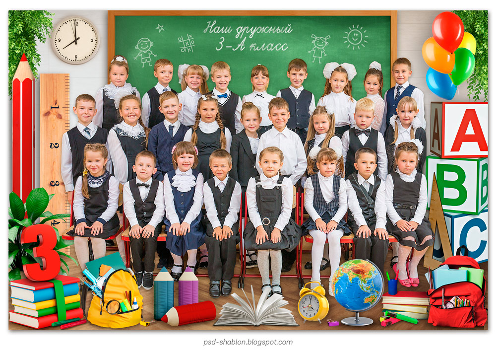 Детский групповой шаблон «Классная комната» подходит для общего фото начальной школы. Многослойный psd шаблон для класса, постановочный шаблон для школьников. Все элементы и шрифты находятся на отдельных слоях (цифры с 1 по 3 класс).