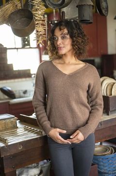 Этот классический узор для вязания свитера дополнен небольшим узором «коса» вдоль V-образного выреза. Этот пуловер вяжется по кругу снизу вверх, затем петли для рукавов набираются на опущенных плечах и провязываются вниз.