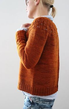 Вяжется платочной вязкой сверху вниз, спинка украшена симпатичными пуговицами. Сначала вяжется несколько коротких рядов взад и вперед, чтобы сделать вырез на спине повыше, а затем вяжется кокетка сверху вниз до разделения рукавов. Вяжется несколько последних коротких рядов, чтобы завершить формирование кокетки, а затем петли рукавов откладываются, и вяжется основная часть до резинки. Рукава вяжутся сверху вниз до манжет. Дополнительная отделка не требуется.
