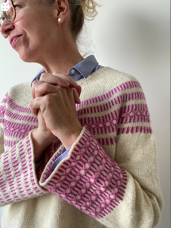 Слияние этих двух видов искусства дает великолепный, привлекающий внимание свитер. Узор — идеальный способ поиграть с цветом, будь то использование всего двух цветов для максимального эффекта, тон в тон для игры текстур или несколько цветов, заставляющих работать мини-мотки. Работа с цветами и вышивка просты, что делает этот узор прекрасным введением в обе техники. Собственно, так и появилось название узора. «Интервал» представляет собой цветную вышивку 1х1 на кокетке, манжетах и скорость последующего нанесения вышивки. «Обучение» означает, что этот дизайн — идеальный способ попрактиковаться в работе с цветом и навыках вышивки!