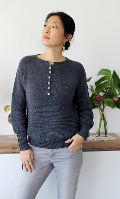 The sample is knitted with Leizu Fingering (90% SW merino, 10% silk, fingering, 385m/115g, colourway: Ardoise) of Julie Asselin.