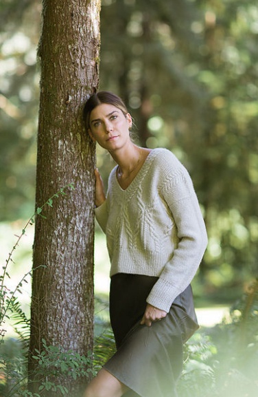 Пуловер оверсайз с глубоким V-вырезом горловины и удачно обрамленным косами вяжется спицами без швов. Узор из кос выполняется по схемам.