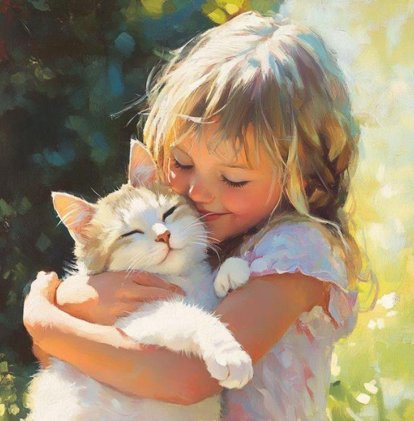 Тёплый солнечный день. Девочка прижимает к груди пушистого котёнка. Мягкий свет скользит по волосам и шерстке, играя бликами в зелёной листве. И в этом нежном объятии — вся радость детства, искренность чувств и любовь.