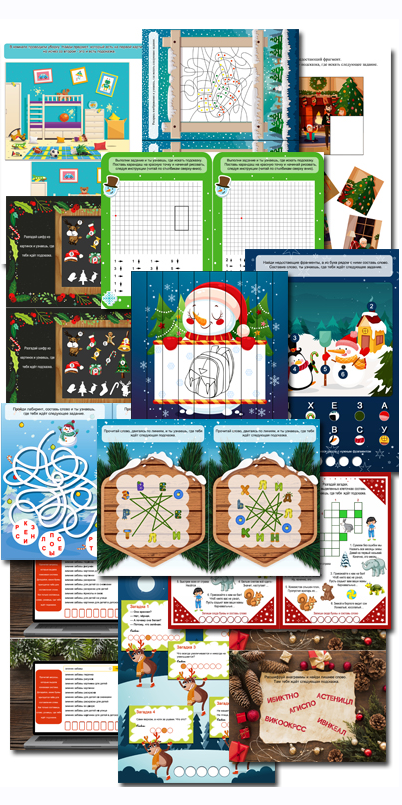Задания оформлены в зимней тематике. Квест может проводиться на Новый Год, новогодние праздники или в любой зимний день.