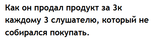 Как он продал продукт за 3к каждому 3 слушателю, который не собирался покупать.