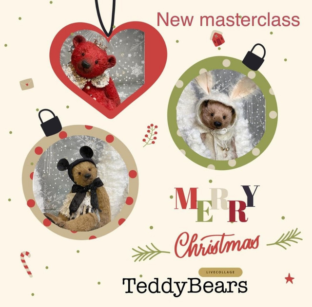 В рамках мастер класса будут три медведя, сшитых по одной выкройке, но в трёх разных дизайнах костюмов — красный с жемчужным воротником, мишка в костюме кролика, и мишка- Микки Маус в полосатых труселях.