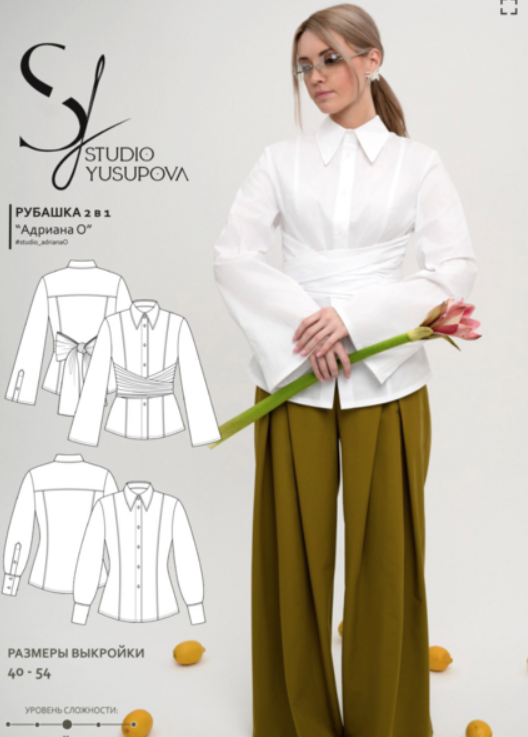 Выкройка рубашки прилегающего силуэта, умеренного объема. Полочки с цельнокроеной планкой. Рельефы по переду и спинке сформированы рельефными швами. По спинке кокетка. Воротник рубашечного типа, отложной, на отрезной стойке. Рукав втачной, длинный, одношовный, рубашечного кроя, с классической линией плеча. По низу рукава заложены складки и выполнен разрез, обработанный планкой. На планке предусмотрены прорезные петли и пуговицы. Манжеты притачные, с застежкой на петли и пуговицы. Низ изделия фигурный, обработан обтачкой. Длина изделия — ниже линии бедер.
