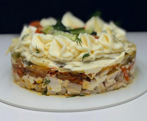 Нежное куриное филе и обжаренные до золотистости лук и морковь с их сладковатым карамельным привкусом создают основу. Солёный огурец добавляет освежающую хрустящую нотку и лёгкую кислинку, которая идеально балансирует вкус салата. Получается сочный, ароматный и очень гармоничный микс.