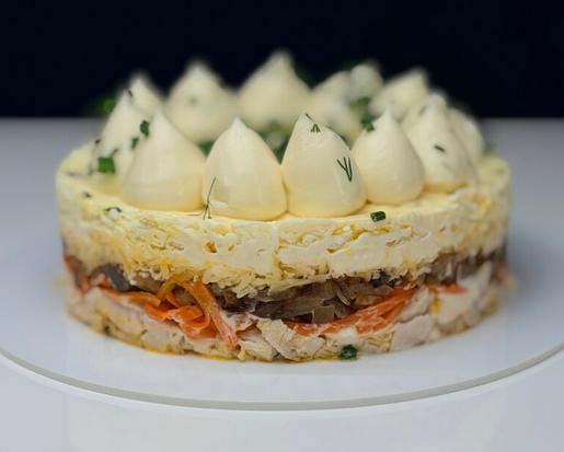 Нежное отварное куриное филе, обжаренные шампиньоны с луком и сыр создают классическую крем-основу. Пикантная морковь по-корейски с чесноком и специями взрывает вкус яркой, острой и хрустящей нотой, а яйца добавляют салату плотности и гармонии.