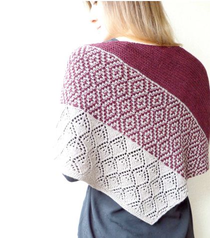 Эта уютная треугольная шаль сочетает в себе красивую графическую мозаичную вязку, подвязку и красивый кружевной узор, повторяющий мотив ромбовидной мозаики.