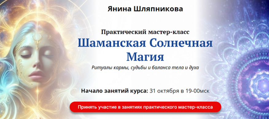 На мастер-классе Янины Шляпниковой у вас будет возможность получить настоящие, шаманские ритуалы солнечной магии, и изменить вектор жизни, убрав все трудности на пути!