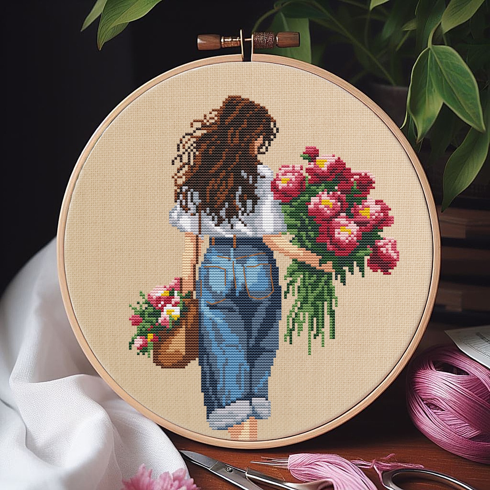 Схема вышивки крестом Girl With Peonies PDF [MyBraveStitch]