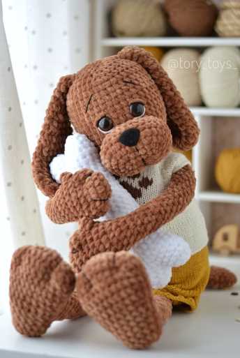 В МК входит детальное описание процесса вязания пёсика, кофточки, штанишек и косточки. Размер игрушки 45см