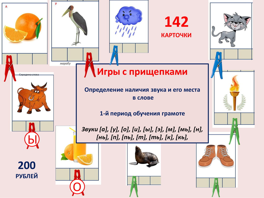 Игра с прищепками. Определение наличия звука и его места в слове. 1-й период обучения грамоте.