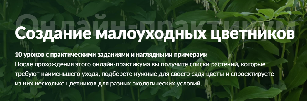 10 уроков с практическими заданиями и наглядными примерамиПосле прохождения этого онлайн-практикума вы получите списки растений, которые требуют наименьшего ухода, подберете нужные для своего сада цветы и спроектируете из них несколько цветников для разных экологических условий.