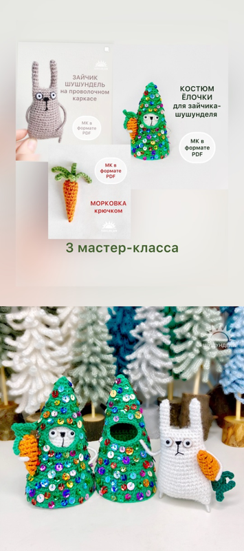 Мастер-класс по вязанию крючком зайчика на проволочном каркасе, мастер-класс вязания морковки и мастер-класс по вязанию костюма ёлочки.