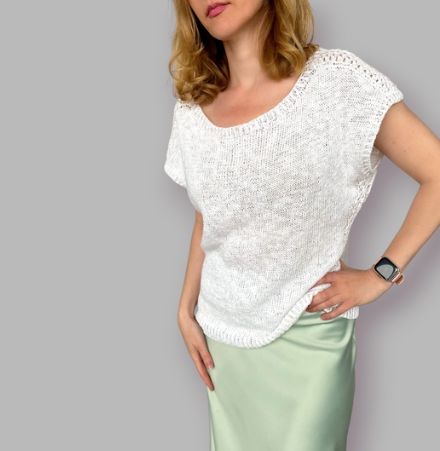 Топ вяжется сверху вниз, используется техника укорочённых рядов МК в формате PDF содержит: Подробная инструкция по вязанию Фото и видео подсказки Расчет на плотность 21 петель в 10 см Оригинальное исполнение кулиски Размеры от 42 по 62 включительно.
