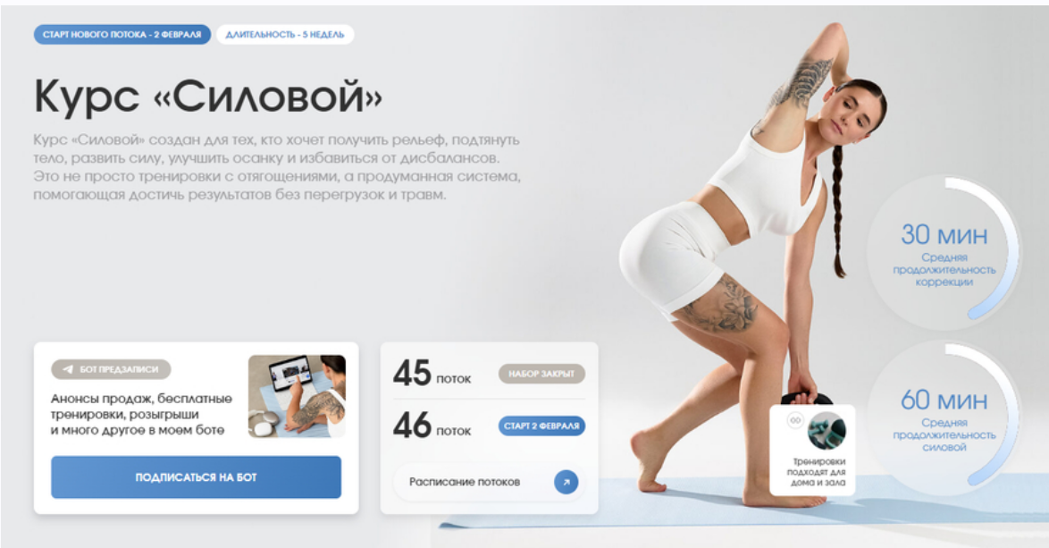 Курс «Силовой» создан для тех, кто хочет получить рельеф, подтянуть тело, развить силу, улучшить осанку и избавиться от дисбалансов.