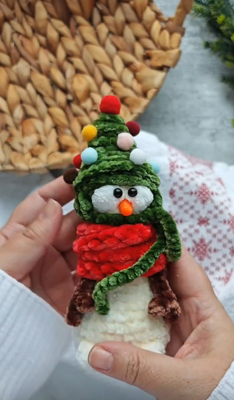 Мастер-класс по вязанию игрушки крючком. Игрушка вяжется снизу вверх одной деталью. Руки, ноги и глаза вывязываются по ходу вязания тела. Шапка и шарф вяжутся отдельно и надеваются на игрушку. Пришивных деталей нет. Необходимые материалы. •Пряжа HiMALAYA Dolphin Baby и её аналоги, метраж: 120м/100гр. Можно использовать остатки пряжи, на одну игрушку потребуется примерно 30 грамм пряжи. •Я использовала пряжу китайский велюр: белый-01, молочный-04, 18-красный, коричневый-20, зелёный-34. •Крючок для пряжи 2,75 или 3мм. •Глазки полубусины 6мм. •Клей гель «Момент» прозрачный. •Помпоны 8-10мм. •Нос-морковка 1,5см. •Наполнитель. •Иголка. •Ножницы. •Маркер для петель. Игрушка из этой пряжи получается примерно 13см в зависимости от качества пряжи, номера крючка и плотности вязания.