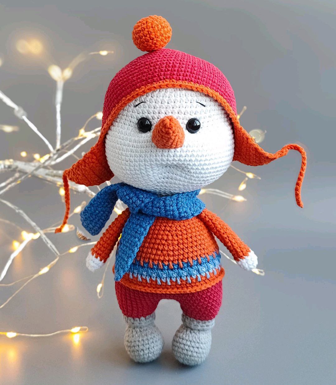 Снеговик вяжется снизу вверх, «полукрестиками», по спирали (если не ука-зано другое). Голова и нос-морковка пришиваются. Глаза приклеены. Шапка и шарф – съёмные. При использовании указанных материалов, высота готовой игрушки около 22 см (без учёта помпона).