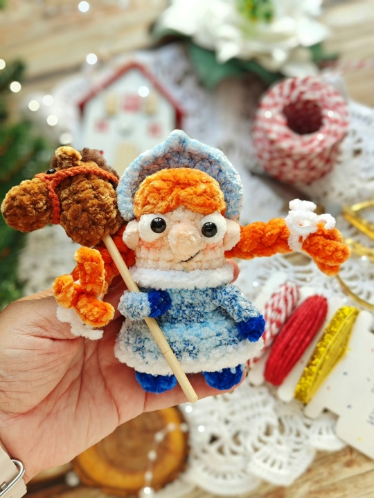 Игрушка вяжется снизу вверх одной деталью. Руки, ноги и глаза вывязываются по ходу вязания тела. Юбка, воротник, уши, варежки ввязываются поверх готовой игрушки. Парик и кокошник вяжутся отдельно и пришиваются на игрушку. Лошадь вяжется одной деталью, грива навязывается сверху.