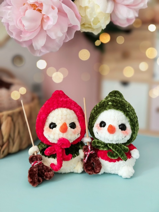 Игрушка вяжется снизу вверх одной деталью. Ножки и ручки вывязываются по ходу вязания тела. Запястья рук надвязываются сверху на готовой игрушке. Шапочка вяжется отдельно и надевается на игрушку. Пришивных деталей нет.