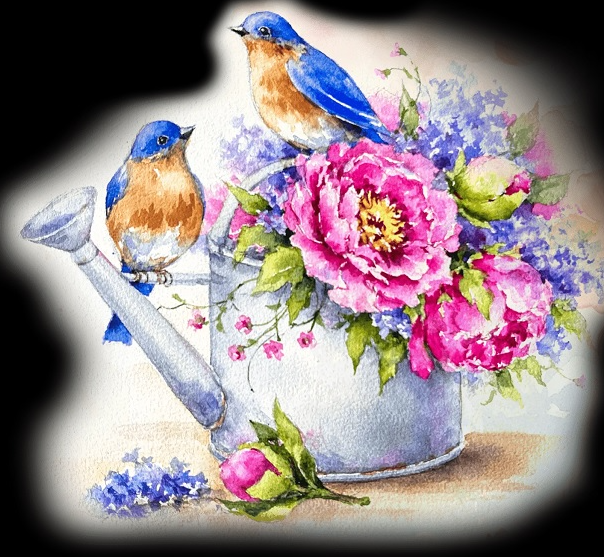 Приступаем к построению композиции из лейки, букета пионов и сирени и двух очаровательных птичек! Создаём объёмное изображение и передаём фактуру металла.
