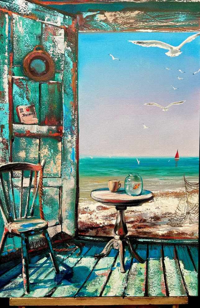Терраса, выкрашенная в нежную голубую краску, словно ведет зрителя к морю, где время кажется замедленным. Старинные стулья и столик, покрытые следами времени, создают атмосферу уютной ностальгии. За окном просторное море и ясное небо, а чайки, летящие высоко, добавляют картине воздушности и легкости. Здесь можно потеряться в мыслях, наслаждаясь красотой природы.