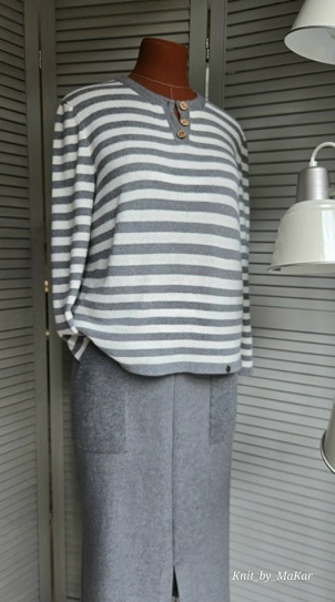 Джемпер с небольшой свободой облегания, круглая горловина с планкой, стыковка полос на всем изделии