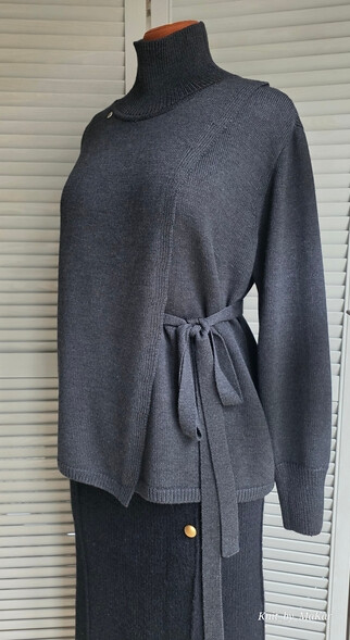 Свитер с драпировкой и пояском, высокая горловина, немного спущеное плечо, небольшая свобода облегания