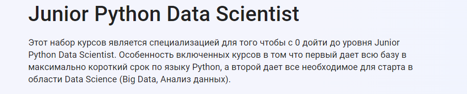 Этот набор курсов является специализацией для того чтобы с 0 дойти до уровня Junior Python Data Scientist. Особенность включенных курсов в том что первый дает всю базу в максимально короткий срок по языку Python, а второй дает все необходимое для старта в области Data Science (Big Data, Анализ данных).